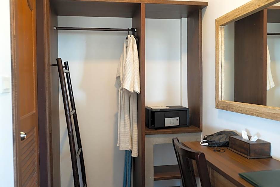 Located on the 2nd floor with a small balcony, this apartment features a bedroom and a living room. Both rooms are air-conditioned and come with a TV. It includes a small pantry and kitchen area with an electric stovetop. There is 1 bathroom.